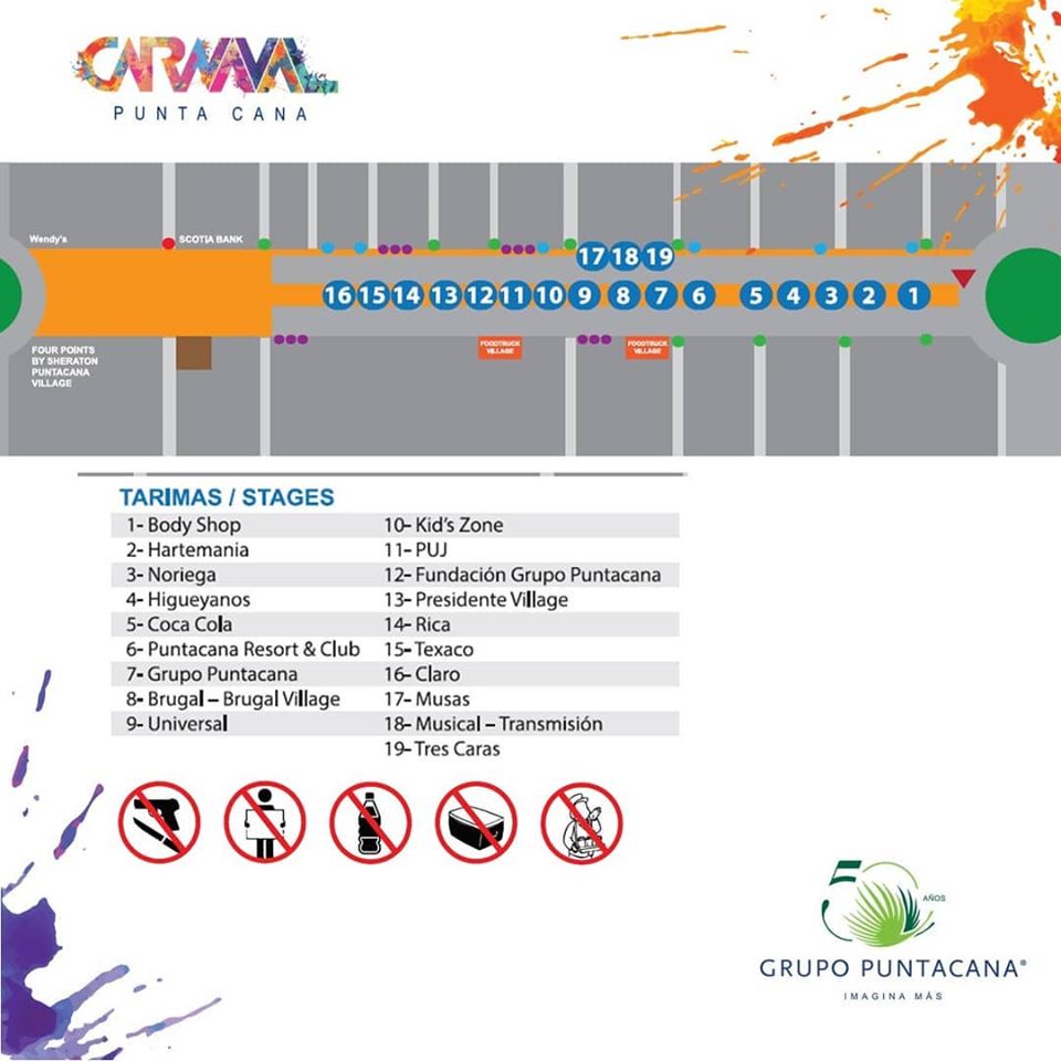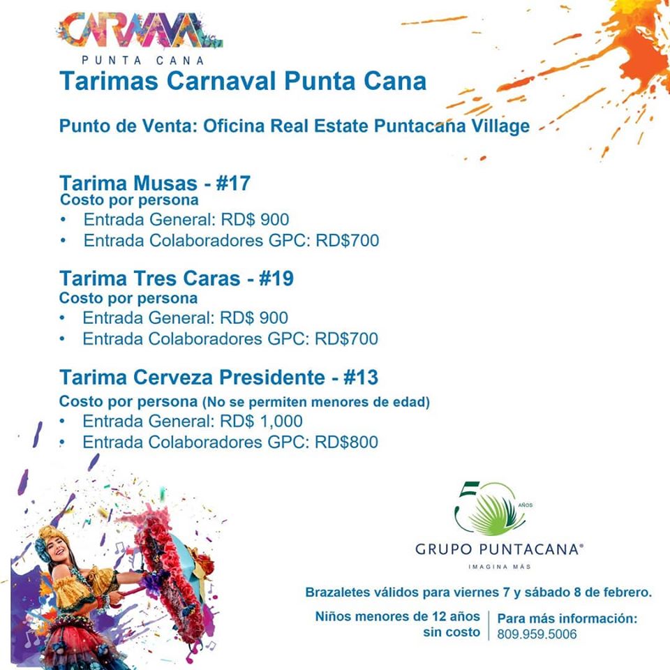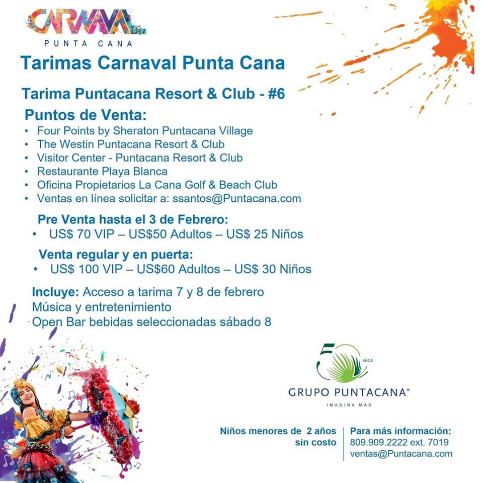 "Carnival of Punta Cana". The parade will be extended to a two-day celebration, on February 8 and 9 at Punta Cana Village. The celebration begins with the parade of the international delegation of Aruba, Curacao, Haiti and Saint Martin, apart from a selection of the best of the Dominican Republic. The parade includes more than fifteen of the best carnival troupes and vibrates with colorful costumes and masks, to showcase the country's cultural and folklore traditions to thousands of locals and tourists from around the world. A live concert that includes the musical genres of Merengue, Bachata and Reguerón, marks the official closing of the carnival.